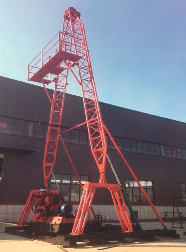 AY-13型鉆塔可配套各種水井鉆機和XY系列巖心鉆機垂直、斜孔的施工。其特點為設計除具有承載能力較大、結構合理、液壓起塔安全可靠,拆裝、搬運成本低等特點外,最顯著特點一是塔腳跨度大(5米),操作鉆機空間大;二是塔身下塔腿連接鉸鏈高于底座底梁2.3米,從而在鉆機左右擺放時下塔腿不影響鉆機前后移車,鉆機動力部分可移至腿支撐內襠中。也使得斜孔鉆進和提鉆過程中天車、回轉、井孔達到三點一線,大大提高了定向井孔施工的精準度及安全。