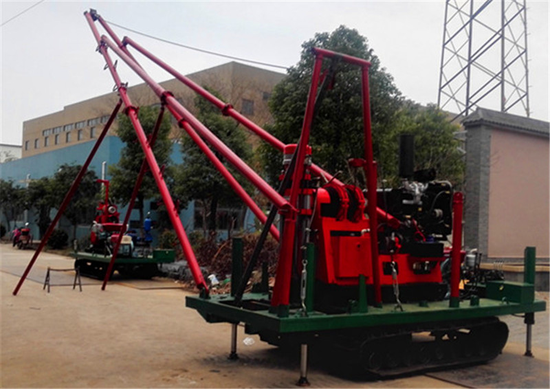 鉆機機組由履帶底盤、柴油機、液壓支腿、鉆機、直斜兩用鉆塔組成,共同組裝在一個機架上。鉆機可以選擇柴油機或電動機、履帶底盤及液壓支腿由獨立柴油機帶動、互不干涉。
